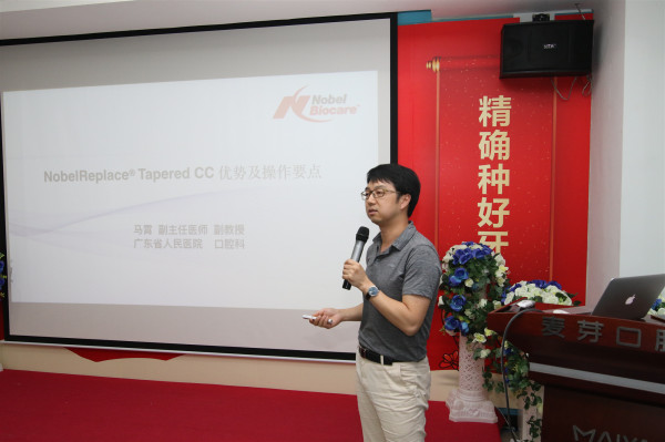 随后,马霄博士就口腔种植诊断与治疗计划制定、口腔种植的解剖基础、种植的预后与评价、上颌窦提升、前牙美学修复、种植外科基本步骤、种植时机等内容进行具体讲授,在谈到NobelReplace® CC种植体时,他特意将与之相关的知识及案例提炼出来,详细向大家讲解了NobelReplace® CC种植体在种植牙领域的优势及应用。