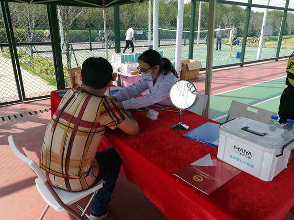 当天下午三点,麦芽"口福小分队",包括医生、护士、后勤人员在内的一行7人已经准备好为市民进行义诊服务了。此次义诊不仅提供了预约服务、血压测量,还为同行的翠湖街道义工、参赛球员们、现场市民们带来了专业的口腔护理知识普及,同时将口腔保健手册,精美的小礼品分发给球员以及现场群众。