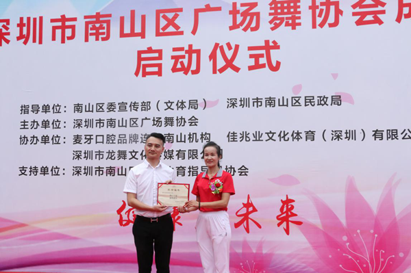 南山区广场舞协会会长郑惠琼(右)为麦芽口腔品牌连锁南山机构颁发热心公益证书