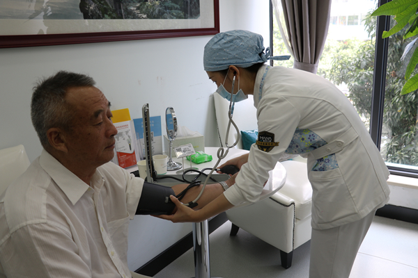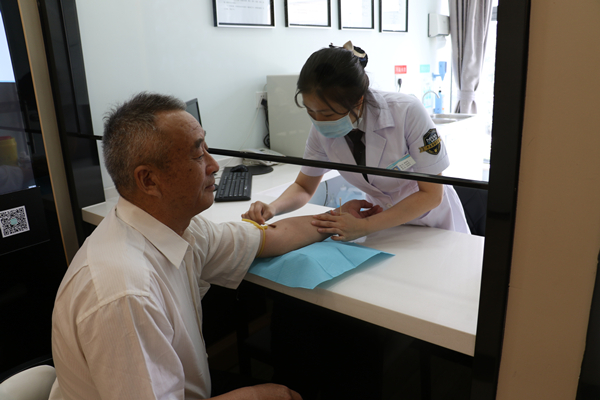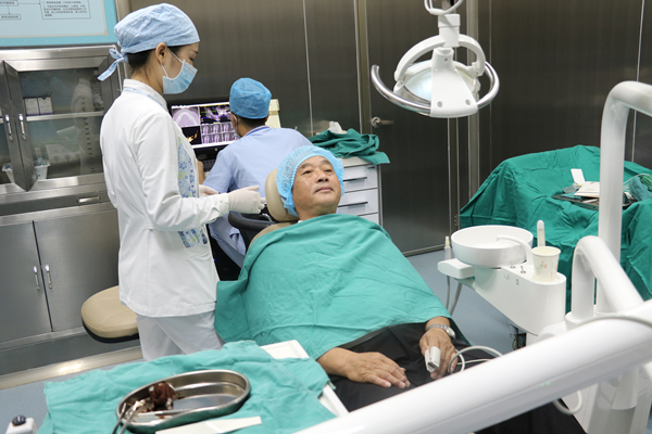 孙博为陈老伯检查口腔情况