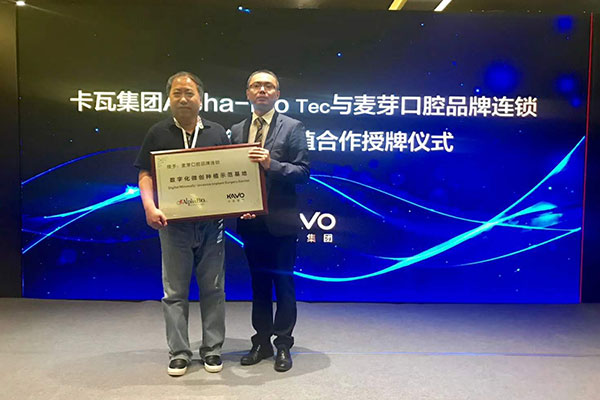麦芽南山机构业务院长邢晓建博士(左)代表麦芽口腔领取德国卡瓦集团颁发的数字化微创种植示范基地牌匾