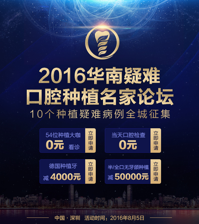 本次学术论坛活动最受益方是深圳的缺牙市民,论坛将面向深圳社会征集10名种植牙疑难案例,由主讲种植牙名家“一对一”面诊,打造可靠的牙缺失治疗方案,为缺牙市民带来福音。