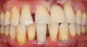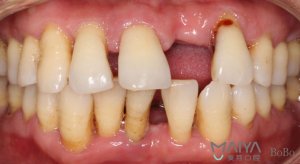 手术前(左上门牙携带活动义齿、右下门牙松动)
