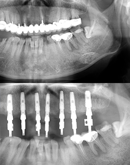 在给我戴临时冠之前,医生让我重新拍了CT,为了检测种植体植入的位置是否有便宜,咬合关系是否有出问题,通过牙片不得不说医生种的“很正”,种牙后我在用冰袋冷敷自己的创口,毕竟种牙的颗数有点多,要说一点不适感都没有那肯定是骗人的,哈哈。上面是我种牙之前的CT,下面是现在刚种完的,我还是很满意的,下面有两个看着发白的牙齿,是我下排根尖周炎的牙齿,后期再说治疗。