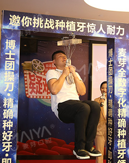除此之外,我还和在场的观众,共同见证了种植体坚固力。都说种植体可以在口内待一辈子甚至更久,这次我倒真的见识了,为什么一颗小小的牙钉真的可以媲美真牙了!4颗牙钉吊起了一个成年人的重量,经受住两个成年人踩压的重量,相信以后我再也不用单侧咀嚼了!