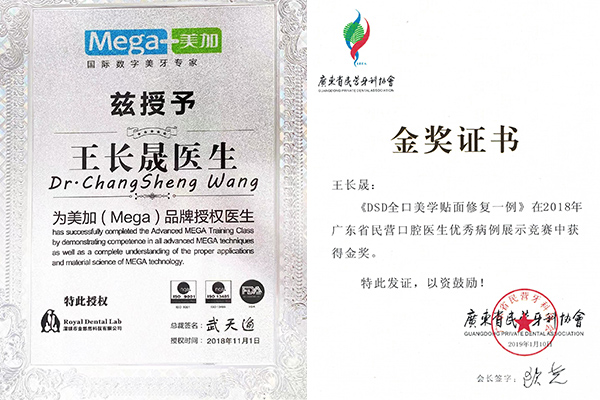 广东省民营口腔病例竞赛种植及修复组金奖、最新技术奖、最佳人气奖