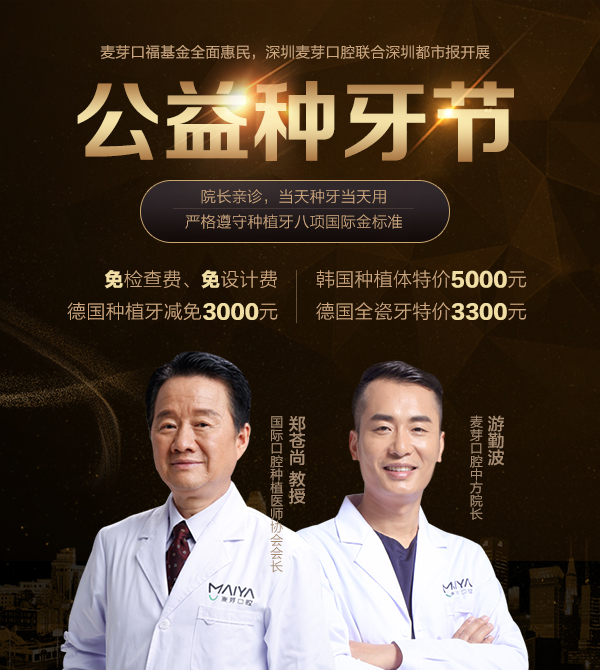 麦芽口腔自成立以来,一直以市民的口福健康为己任,热衷于举办各种公益活动,走进近200个社区开展口腔检查健康公益行,慰问养老院及拓黄牛,帮市民检查身体,定期开展口腔健康知识讲座,普及口腔知识。现已为数千人重拾口福健康,得到市民的认可和点赞,麦芽口腔的公益活动还将持续进行中,麦芽公益种牙节限时惠民,1000个公益种牙名额等你来抢!