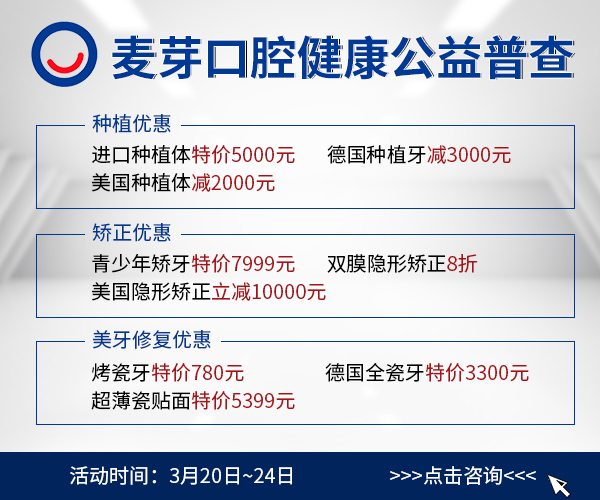 为了提高大众对良好口腔健康及其对全身健康和幸福生活重要性的认识,增强口腔健康观念,麦芽口腔特推出全民口腔健康公益普查,在3月20日至24日,凡是通过网络或者拨打麦芽口腔预约热线0755-82339968进行预约来院,即享0元口腔检查(价值500元),检查包括:牙周、龋齿、牙缺失、牙结石、牙体牙髓等口腔内窥镜、口腔全景片。