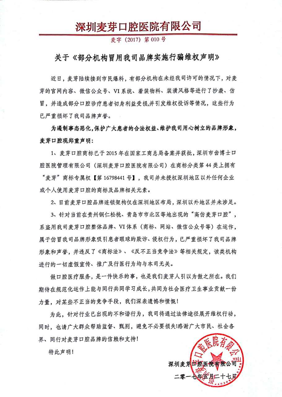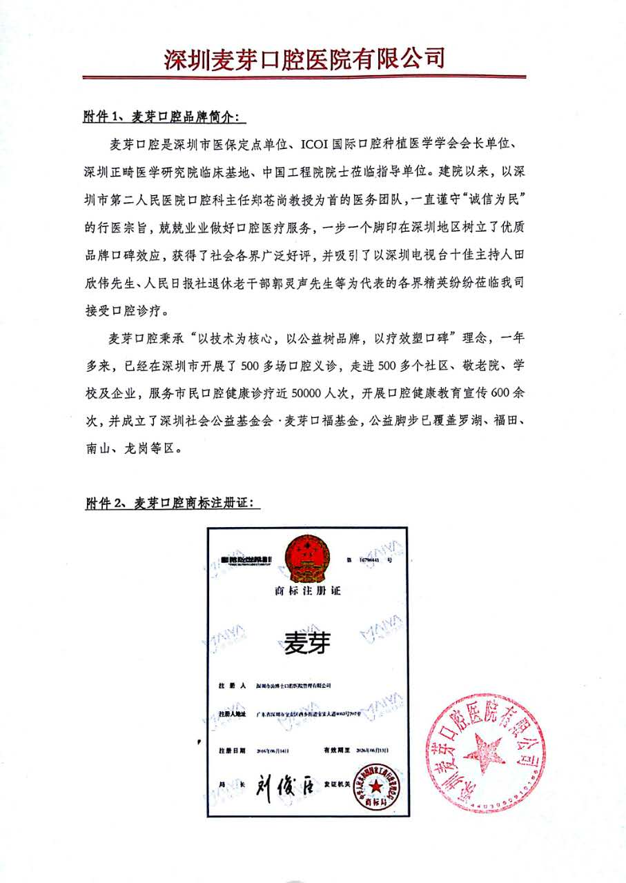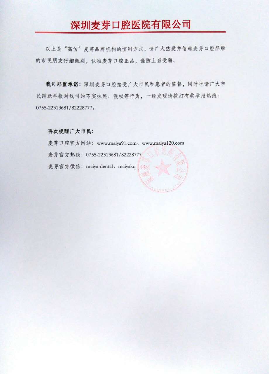 关于部分机构冒用我司品牌实施行骗维权声明 麦芽智能AI在线 · 点击咨询 来源:麦芽糖编辑社 更新:2017-07-10 10:51 麦芽品牌 · 快速导航 品牌诠释 院长寄语 学术交流 社会公益 专家智库 经典案例 安全体系 先进设备 品质管理 精彩视频 院内环境 来院路线 咨询优惠 点击预约 MAC数字化口腔 精确诊疗体系倡导者 申请方案设计 接诊范围·专精疑难 缺牙种植 歪牙正畸 美齿修复 综合治疗 欢乐儿牙 点击分诊 运用数字科技 量齿定制专属方案 申请方案设计 数字化口腔精确科技倡导者 精确影像采集 精确数据提取 智能方案设计 一站式研发智造 数字化精确种牙 数字化精确正畸 预约体验 麦芽品牌 大咖寄语 *说明:文章信息仅供参考,不作为临床口腔医学诊断依据。 上一篇:浓情端午节,牙好粽子香 下一篇:麦芽618亲子日,我带宝宝来护牙 MAC数字化精确口腔诊疗体系 MORE → MAC博士专家智库 MORE → MAC智能挂号平台·就医绿通 *智慧云挂号由麦芽口腔自主研发,采用双系统加密,保障市民隐私。 姓 名: 症 状: 选择挂号科室 缺牙想种牙镶牙 歪牙想矫牙美齿 色素牙想持久美白 蛀牙烂牙想补牙 形态不佳想美齿 其他牙齿问题 验 证: 获取验证码 手机: 机构: 请选择来院机构 罗湖机构 南山机构 宝安机构 福田机构 龙华机构 系统智能推送 清空信息 点击提交 *提交信息后,工作人员将致电回访,与您确定到院时间,小麦为您自动排号,为您节省看牙的时间。