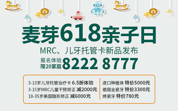 麦芽将于6月18日的亲子活动日,宣传儿牙如何保护、教导小朋友如何养成良好的口腔习惯,从而避免形成牙齿、颌面畸形。同时您的小孩子,还将摇身一变成为小牙医,通过与医生亲密互动学到的知识,为您检查牙齿、与你分享自己的小秘密,从而让你和宝宝的关系更亲密。
