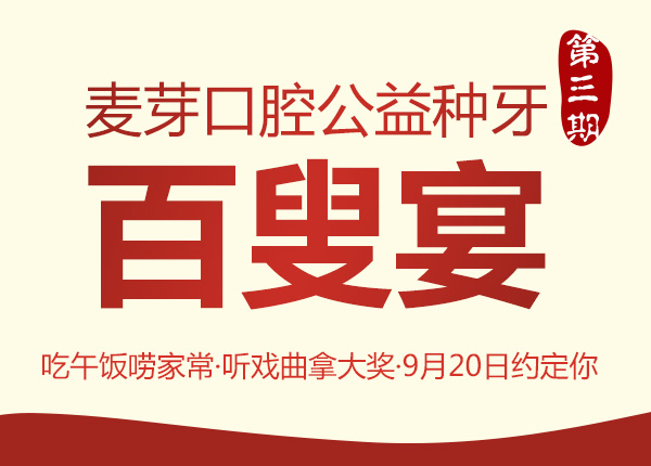 缺牙的你,美食嚼不动、咬不烂……吃饭不是享受,而是折磨!缺牙的你是否还在担心活动牙、烤瓷牙不好用?想种牙又有很多疑问?为了向市民更好的普及口腔健康知识,帮助市民在缺牙修复上做出更好的选择,在9月20日,麦芽口腔将举办"幸福晚年有口福 公益种牙百叟宴"第三期,现在网络报名预约,还能享受特价种植体4800元的优惠!