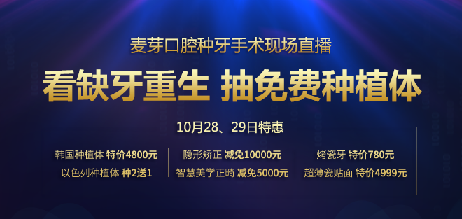 本次"种植牙手术直播"特别适合单颗多颗牙缺失、全口或半口牙缺失、牙齿松动、活动假牙不适、活动牙修复失败、烤瓷牙失败等人群观看。此外,在活动现场,麦芽口腔还为朋友们设置丰富且极具诱惑力的奖品,除了精美的随手礼、缴费礼之外,以色列 MIS 种植体种 2 送 1,Nobel 系列种植体减免2800元,韩国种植体特价4800元,心动了吗?更为心跳的是还可以抽取价值12000元种植体!如果您正在犹豫着要不要种牙,那就不要错过这次盛会了,毕竟缺牙问题总是要解决的,长时间不处理会危害健康,而且能够零距离了解种植牙的机会不多!力度这么大的优惠也不常有!