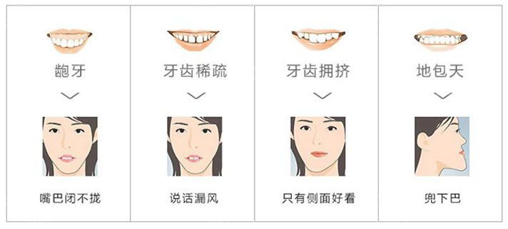 牙齿不齐易塞牙、口臭,引起蛀牙、牙周疾病,更有甚者形成小鸟嘴、弯月脸等,造成面部发育畸形。