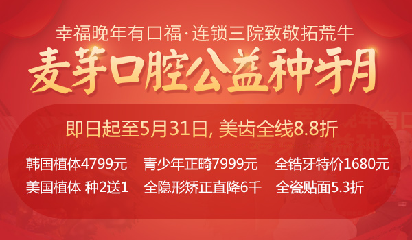 麦芽口腔(医疗服务质量A级单位、医保定点单位)品牌成立至今始终以市民的口福健康为己任,开展了各类牙周疾病检查、儿牙口腔问题筛查、种牙矫牙美牙福利等公益活动,5月麦芽公益种牙月继续践行公益理念,现在预约即享进口种植体特价4799元,还有美齿全线8.8折等超值优惠,千万不要错过哦!