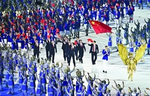 晚上七点,体育场内歌声响起,人们欢呼雀跃,身穿蓝白色服装的表演人员站立在舞台左右,组成一条蜿蜒的通道,各国运动员代表团队伍依次出场,仿佛一条波澜壮阔的大河从山的远方奔腾而来,每一次用力挥动的国旗都是自豪的表露,每一个热情的微笑都是自信的象征。现场的观众欢呼声迭起,大家将热烈的掌声送给每一个运动员,表达着对他们的赞叹和敬仰。