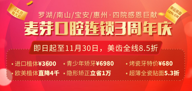 为了回馈市民,麦芽口腔三周年抛出全年种牙最低的折扣!!而3600元的植体,你还能参与幸麦芽运转盘抽送家电,来院即送超值豪华大礼包...礼品多多,但是为了保证就诊质量,院内专家每日接诊数量有限,所以仅限网络预约顾客哦~~~