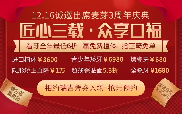 即日起至12月16日,点击报名参与麦芽口腔三周年庆典活动,入场即享豪华大礼包,还有机会赢得麦芽数字化insignia精因矫治免单大奖,因场地有限,会场名额只接受网络预约顾客<点击申请>。