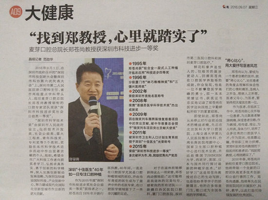 2016年9月1日,在深圳市政府召开的“深圳市科技大会暨深圳市科协第六次代表大会”上,深圳市第二人民医院原口腔科主任、省市两级学科、现任麦芽口腔总院长郑苍尚教授领衔的口腔专家团队荣获“深圳市科技进步奖社会公益类一等奖”。