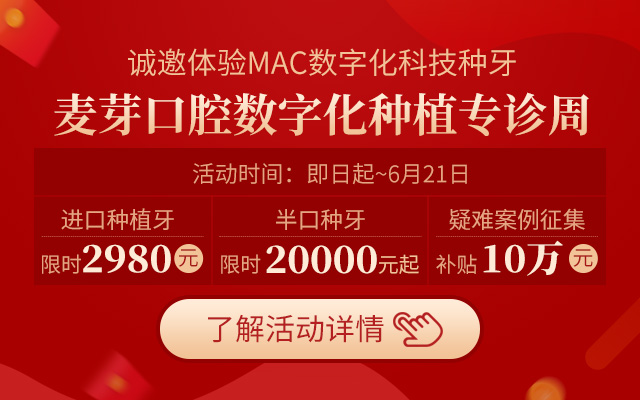 解析无牙颌数字化种植牙核心技术,探讨数字化种植牙技术应用的金标准。为了让本次研讨会的最新成果更多地应用于临床,2020深圳无牙颌数字化种植技术研讨会举办期间,麦芽口腔诚意推出“数字化种植专诊周”。如果您正在受长期牙齿缺失、骨量不足、半口无牙、全口无牙等问题所扰,可预约来院咨询种牙专家大咖,优享最新数字化种牙技术,并尊享半口种牙2万起、NOBEL半口种植牙6折等优惠。预约热线:0755-82339968
