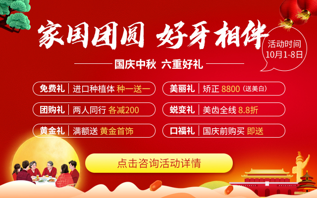 为了回馈新老顾客麦芽口腔特向广大消费者推出“家国团圆、好牙相伴”双节主题促销活动,六重壕礼享不停:双节免费礼-种牙享特定种植体种一送一;双节美丽礼-成人美学金属矫正特价8800元,加送诊间美白1次;亲情团购礼-两个同行立减200元;双节蜕变礼-10月1日至8日,修复治疗所有项目均享8.8折优惠;成交惊喜礼-活动期间成交即送精美礼品1份,洗漱套装、电动牙刷、黄金饰品…等你来;中秋口福礼-10月1日至8日前购买项目即送惊喜礼品1份,实实在在给予广大顾客看牙实惠。国庆中秋福利多多,抓紧时间预约吧!预约热线:8233 9968。