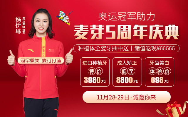 11月28日,麦芽口腔5周年庆典嘉年华正式开启,为期两天,五院同庆,惊喜不断。届时,免费抽进口种植体、品牌全瓷牙、消费满额砸金蛋、储值赠送、0元体验数字化诊疗服务等多重专属特惠,更令人惊喜的是:奥运体操冠军杨伊琳助阵五周年庆典嘉年华,将走访麦芽口腔罗湖福田机构,她将现场与顾客互动,谈口腔保养,并送上冠军神秘礼物,期待您的参与!