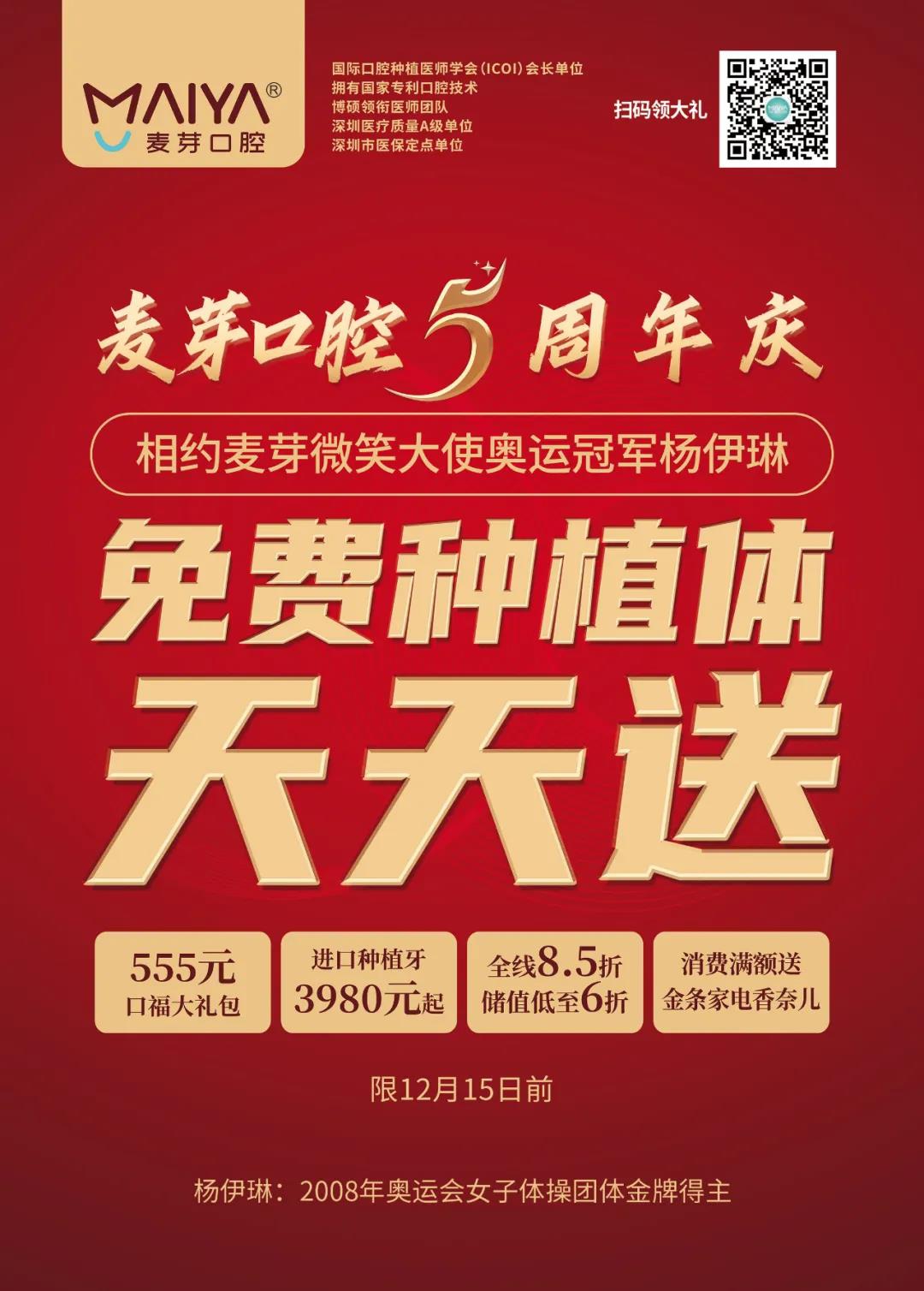 口福同行,感恩有你。麦芽口腔5周年庆典嘉年华“一口好牙,五福同享”在一片欢呼声中圆满落幕。为了回馈新老朋友,麦芽的5周年感恩回馈活动仍在继续,即日起至12月15日,来院即送555元口福红包,消费满额还送金条、智能电视、迪奥口红、香奈儿香水等时尚好礼,消费满3000元可参与抽奖,各类好礼应有尽有,此外,更有进口植体感恩特价1980元/颗,进口种植牙3980元,成人矫牙送美白等年度优惠。错过庆典当日活动的市民朋友可以拨打热线电话:8233 9968进行咨询。
