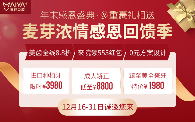 麦芽口腔自2015年成立以来,始终秉承“以技术为核心,以公益树品牌”的理念,在精研数字化口腔诊疗技术的同时更致力于服务深圳市民,为了将这份关爱一直延续下去,让更多的市民拥有一口好牙,提升幸福生活品质,麦芽口腔迎来年终感恩回馈季活动,更有进口种植牙低至3980元,成人矫牙送美白等特大优惠!现在预约,还可享博硕专家一对一亲诊,更多感恩回馈季优惠,麦芽口腔等您来。