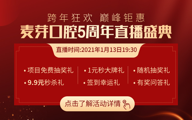 麦芽口腔5周年直播盛典,跨年狂欢,巅峰钜惠,5年才有一次这样的大型直播盛事,0.01元即可抢钻石吊坠;1元就能秒杀全家福检查套餐、基础检查套餐或价值数千元的数字化方案设计,还加送品牌定制漱口水;9.9元秒杀口腔爆款,还可参与秒杀抽奖,赢迪奥口红、香奈儿香水、施华洛世奇手链;参与直播,还可参与大牌种植体、数字化导板、全隐形矫正免单,价值数万的名额免费送送送。5年才有这一次盛惠,千万不要错过。咨询热线:0755--8233 9968。