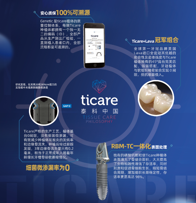 Ticare (泰科)作为世界牙医联盟(FDI)推荐种植体,是全球应用最广泛的种植体品牌之一,由西班牙MOZO GRAU公司研发,畅销全球数十个国家。2005年,Ticare 种植体因其优越的骨结合速度、超强的初期稳定性与独一无二的美学修复能力,获得美国休斯敦优质奖,成为了西班牙贵族专用口腔修复植体品牌。