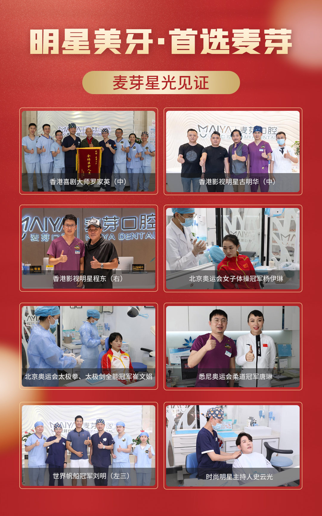 麦芽的潜心耕耘吸引了众多明星名人前来看牙美牙,特别是“奥运冠军口腔健康管理基地”落户以来,麦芽口腔先后为北京奥运会体操冠军杨伊琳、北京奥运会太极拳太极剑冠军崔文娟、悉尼奥运会柔道冠军唐琳、世界帆船冠军刘明、中国第一位举重奥运冠军曾国强等进行口腔健康管理及治疗,更凭借卓越的口腔诊疗技术,吸引香港著名喜剧大师罗家英、香港著名影星程东、香港著名影星古明华、香港金牌导演李力持、时尚主持人史云光等众多明星名人前来种牙美牙。