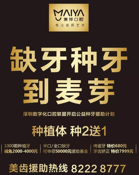 由联盟发起麦芽口腔执行的"深圳市民种植牙公益援助计划",即日起至4月30日,针对单颗、多颗牙缺失、疑难重度牙缺失、全口无牙颌人群,推出不同的援助计划,1、1000颗种植牙援助费用减免2000-4000元;2、种植体种二送一;3、半口或全口无牙患者,每人送50000元的公益援助基金。