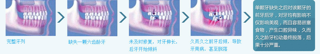 牙齿拔除后(智齿除外)应及时进行修复,否则与被拔掉牙相对得牙齿会明显盛昌,两侧邻牙也向空隙处倾斜,导致牙齿松动甚至脱落。