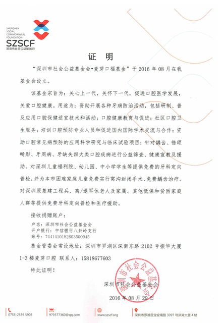 在深圳都市报、深圳市社会公益基金会、深圳市老年人体育协会、深圳麦芽口腔各级领导的共同见证下,麦芽口福基金成立,并全面开启首届社区老年人口腔公益普查活动。呼吁市民朋友关注口腔健康,定期进行口腔检查,有缺牙困扰的市民朋友更要提早到正规口腔机构治疗,早日找回口福。