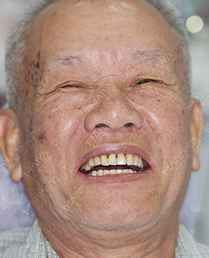 由于严重的牙周病,他的上半口牙齿全掉光了,下牙也缺了一颗,硬的、粘的、肉类都没法吃。蒋先生在女儿的陪同下到麦芽口腔口腔看牙,接受了麦芽口腔的即刻负重种植牙手术,通过创新性地应用拱形受力原理,仅植入4颗种植体,达到12~14颗牙的修复效果,马上戴上临时牙冠,恢复咀嚼......