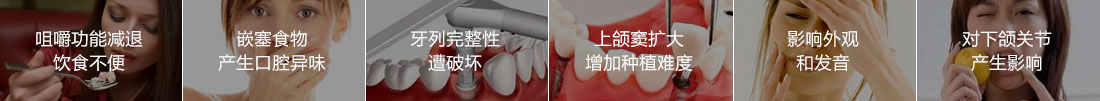 缺牙者长时间不补,由于缺牙区牙槽骨得不到生理性的咀嚼刺激而逐渐发生萎缩和缺牙间隙的变小,严重者将完全失去镶牙的可能性。缺牙问题影响个人的学习、工作和生活,甚至比口腔健康的同龄人寿命短10-20年。